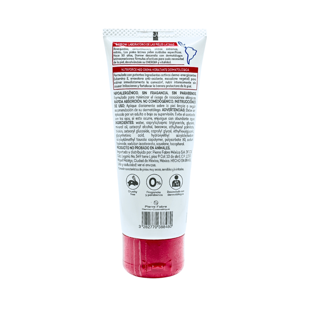 Darrow Nutriforce MED Crema  es la gama dermatológica especialista en la hidratación de las pieles latinas secas y con tendencia atópica. Darrow Nutriforce Med posee, en su fórmula exclusiva, un complejo nutrihidratante (ácidos grasos + glicerina) que repara y fortalece de forma duradera la barrera protectora de la piel, y un complejo restaurador-calmante (cera alba + enoxolona) que calma la piel inmediatamente. Con una eficacia comprobada científicamente Nutriforce MED es hipoalergénico y sin fragancia. Lo pueden usar los adultos y los niños desde los 3 meses de edad, no arde ni deja olor en la piel.