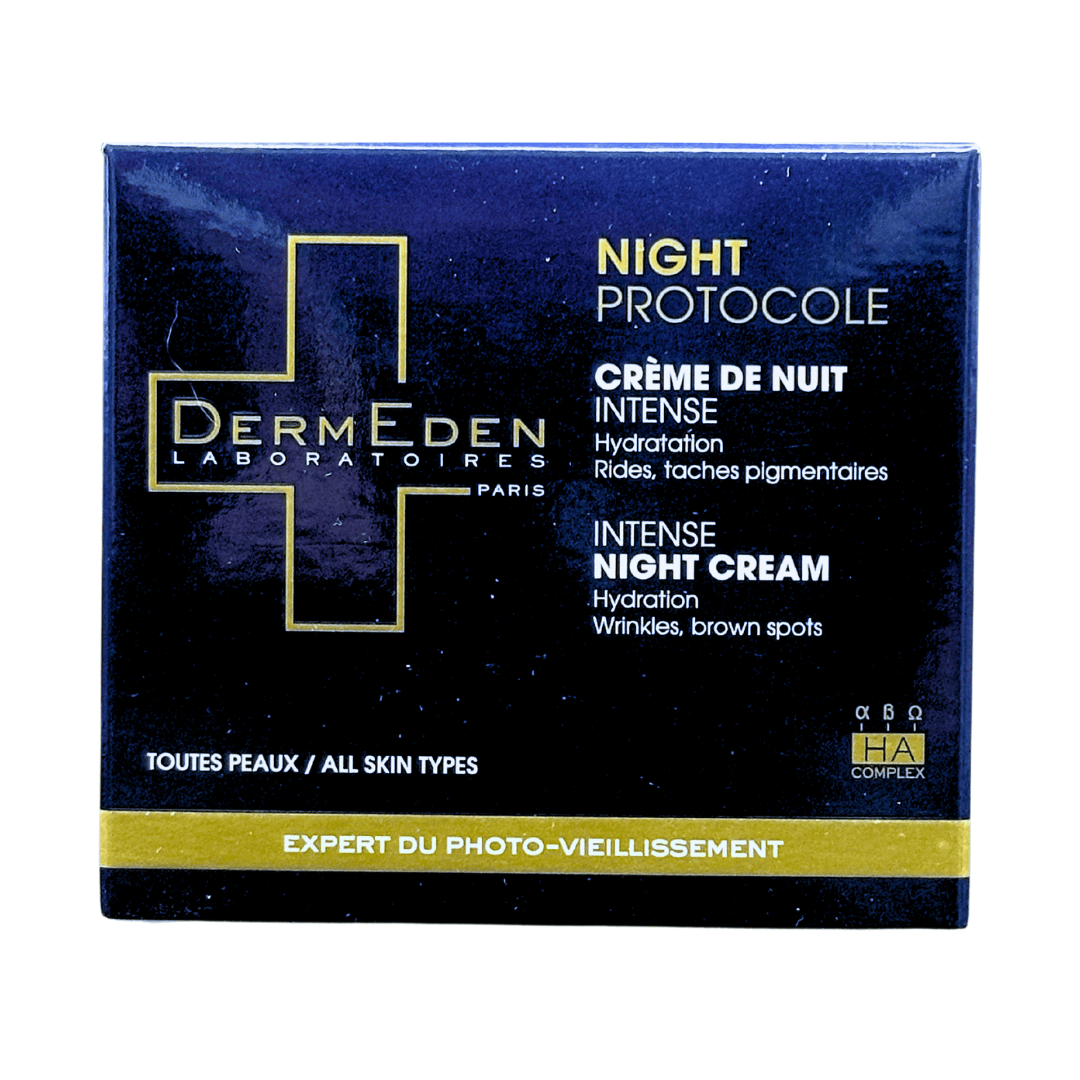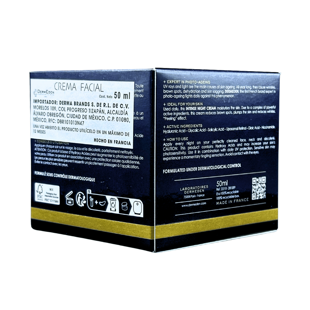 Dermeden Night Protocole Creme de Nuit Intense esta crema de noche está formulada a partir de la combinación única de tres tipos de hidroxiácidos: αHA – ácido glicólico, βHA – ácido salicílico y ΩHA – ácido dióico. Reforzado con Retinol y Niacinamida, este complejo de activos con efecto “peeling” trata las manchas de pigmentación, hidrata y regenera la piel.