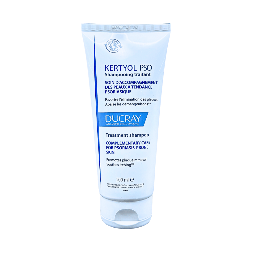 Ducray Kertyol pso shampoo El shampoo auxiliar de tratamiento reequilibrante ayuda a eliminar las placas secas y a calmar la comezón* en el cuero cabelludo.