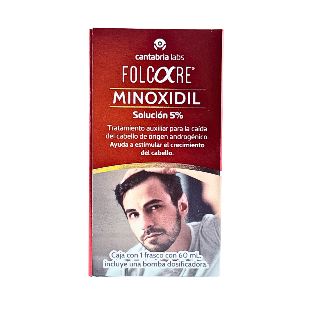 Cantabria Labs Folcare Minoxidil solución 5% Tratamiento de la alopecia androgenética y alopecia areata. folcare es una solución hidroalcohólica transparente o ligeramente amarillenta para aplicación sobre la piel.