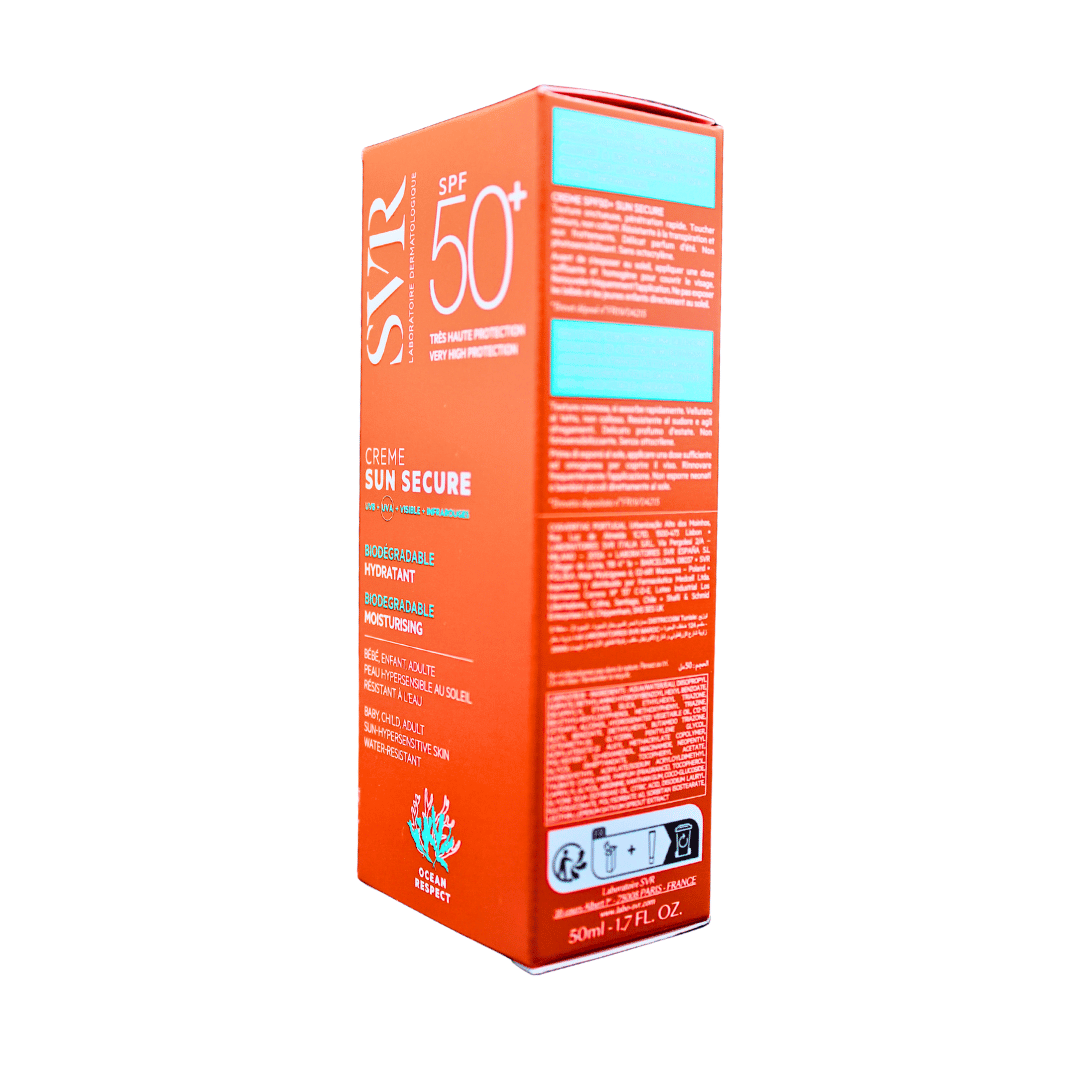 SUN SECURE Crème SPF50+ nos da una protección dermatológica muy alta que nos protege frente a todo tipo de rayos solares(2) , gracias a la nueva combinación de filtros patentada(1) que respeta al medio marino
