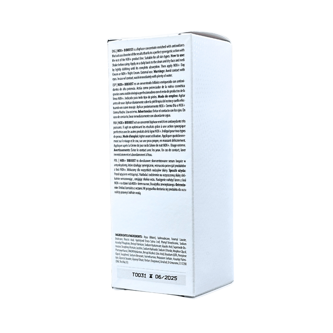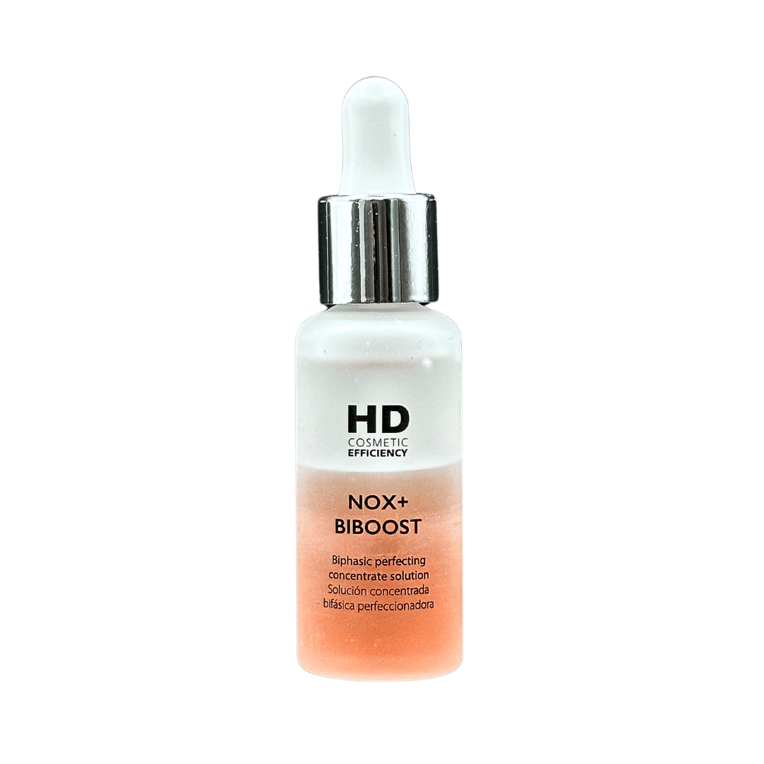 Hd Cosmetic Nox + Biboost es un suero bifásico antioxidante, formulado para todo tipo de pieles, sobre todo para aquellos que buscan atenuar los efectos de la oxidación ambiental causada por lo radicales libres.