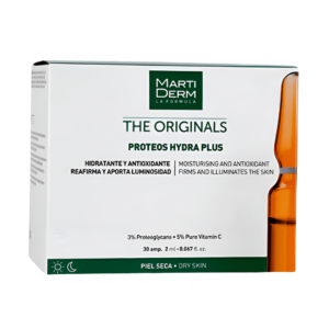 MartiDerm The Originals Proteos Hydra Plus están especialmente recomendadas para pieles secas, ya que aportan una hidratación profunda. Fórmula hidratante y reafirmante que actúa desde la primera aplicación con proteoglicanos y Vitamina C, que proporciona luminosidad y ayuda a disminuir las arrugas.