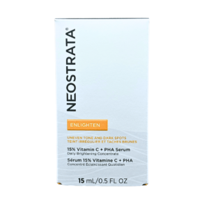 Neostrata Enlighten Serum de Vitamina C (Ácido L-ascórbico puro estabilizado al 15%), también contiene 2% de PHA para exfoliar suavemente las células superficiales de la piel y permitir que la Vitamina C sea absorbida en las capas superficiales renovadas.
