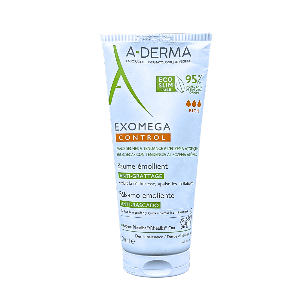 A-Derma Exomega Control Balsamo emoliente anticomezón alivia instantáneamente la sequedad, las rojeces, la irritación y reduce el picor en un 95 % en las pieles secas con tendencia al eccema atópico.