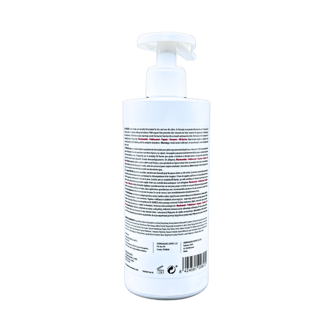 Su fórmula incorpora Niacinamida y Polidocanol, con acción calmante que alivia el picor y el enrojecimiento. La Papaína promueve la renovación de la piel y ayuda a mejorar su apariencia cuando está extremadamente seca. El complejo Oil barrier ayuda a enriquecer la función barrera de la piel para dejarla suave y nutrida. Textura rica de rápida absorción. Testado Dermatológicamente. Sin alérgenos.