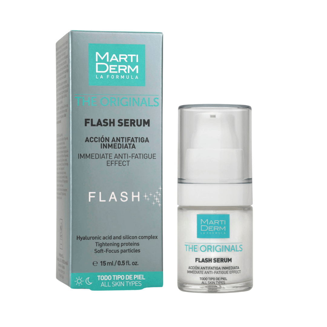 MartiDerm The Originals Flash Serum 15 ml mantiene todos los beneficios de la ampolla Flash: antifatiga inmediata, disimula arrugas e imperfecciones para una una piel más hidratada y flexible desde el primer momento.