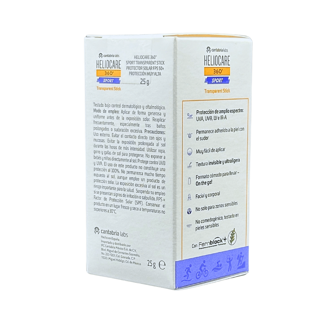 HELIOCARE 360 SPORT Transparent Stick SPF 50+ cumple con las más altas exigencias en materia de fotoprotección. Su fórmula con filtros específicos y Fernblock®+ protege frente a los 4 tipos de radiación (UVB, UVA, Visible e Infrarroja). Además, Fernblock®+ junto con los activos protectores y antioxidantes neutralizan y protegen del daño solar. Alta tolerancia cutánea. Testado bajo control dermatológico y oftalmológico.