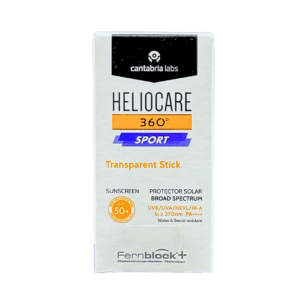 Cantabria Heliocare 360 Sport Transparent Stick SPF 50+ es un protector solar de muy alta fotoprotección en barra. Gracias a su formato, podrás llevarlo a cualquier parte y aplicarlo sin necesidad de extenderlo con las manos. Imprescindible para los amantes de deportes y actividades al aire libre. Facial y corporal. Apto para todo tipo de pieles, incluso pieles sensibles, resistente al agua, permanece adherido a la piel con el sudor y con acabado invisible.