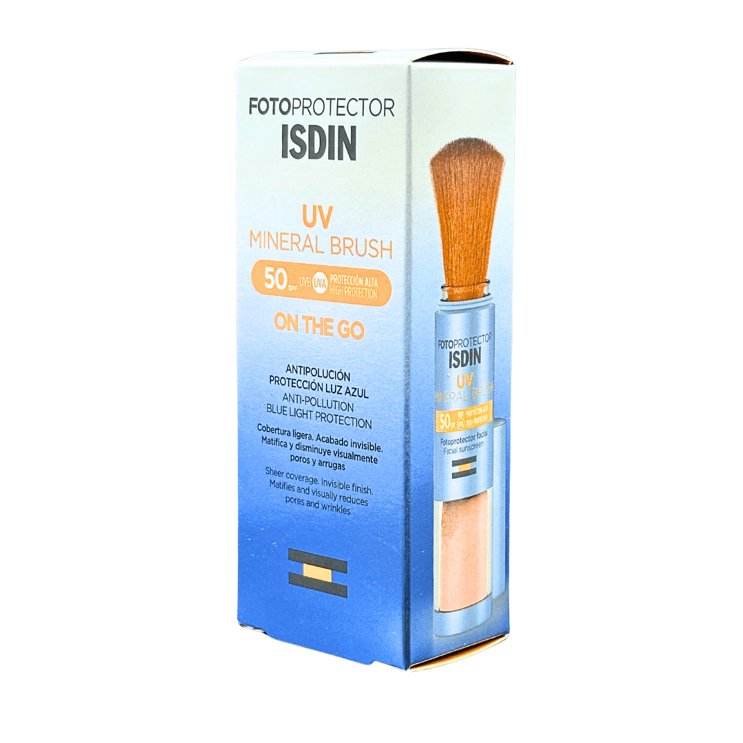 ISDIN UV MINERAL BRUSH ON THE GO Protege tu piel contra la luz azul y la radiación UVB/UVA con el fotoprotector facial en brocha UV Mineral Brush SPF 50+ Con Filtros 100% minerales y efecto antipolución, está indicado para su aplicación sobre el maquillaje,