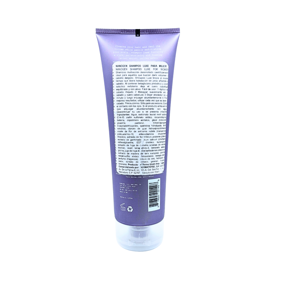 Nanogen Shampoo Luxe For Woman es un shampoo voluminizador maravilloso, libre de sulfatos y parabenos, diseñado para limpiar suavemente el cabello y el cuero cabelludo mientras crea un efecto espesante instantáneo desde el primer lavado.