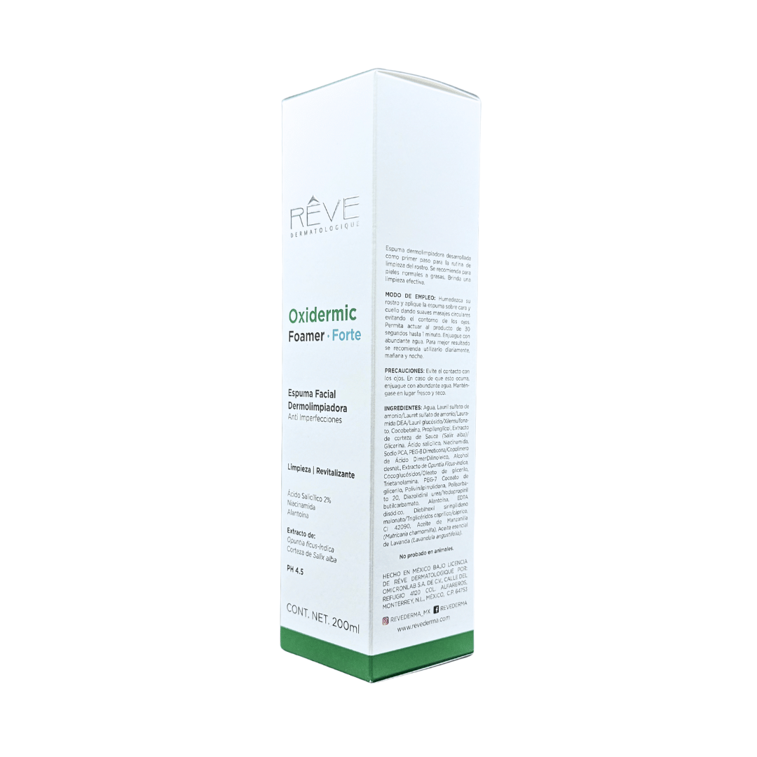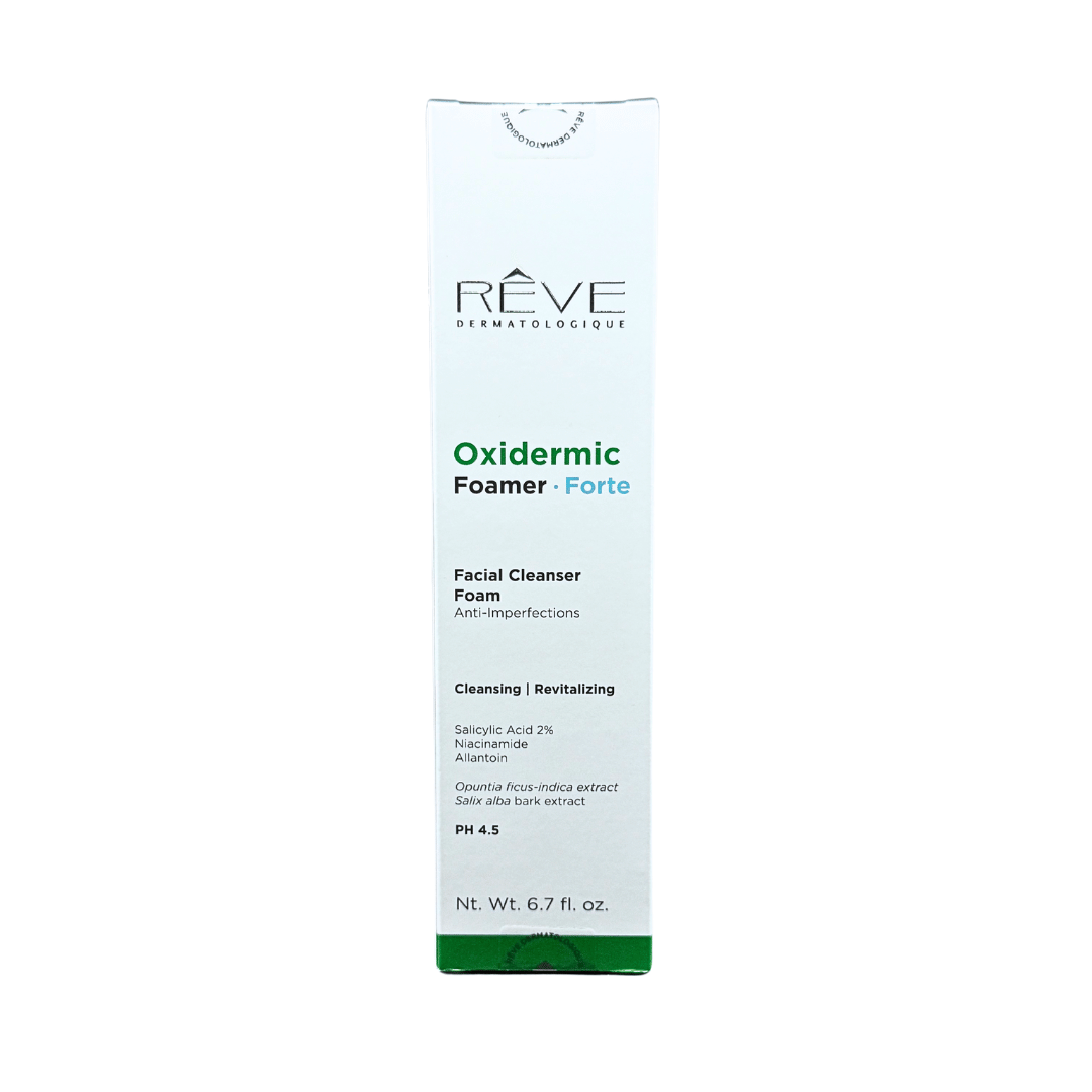 Reve Oxidermic Foamer Forte es ideal para la limpieza de pieles muy grasas y con tendencia acneica. Esta espuma ayuda a mejorar la apariencia de la piel ya que el ácido salicílico es un excelente seborregulador, por lo que disminuye la sobre secreción de sebo.