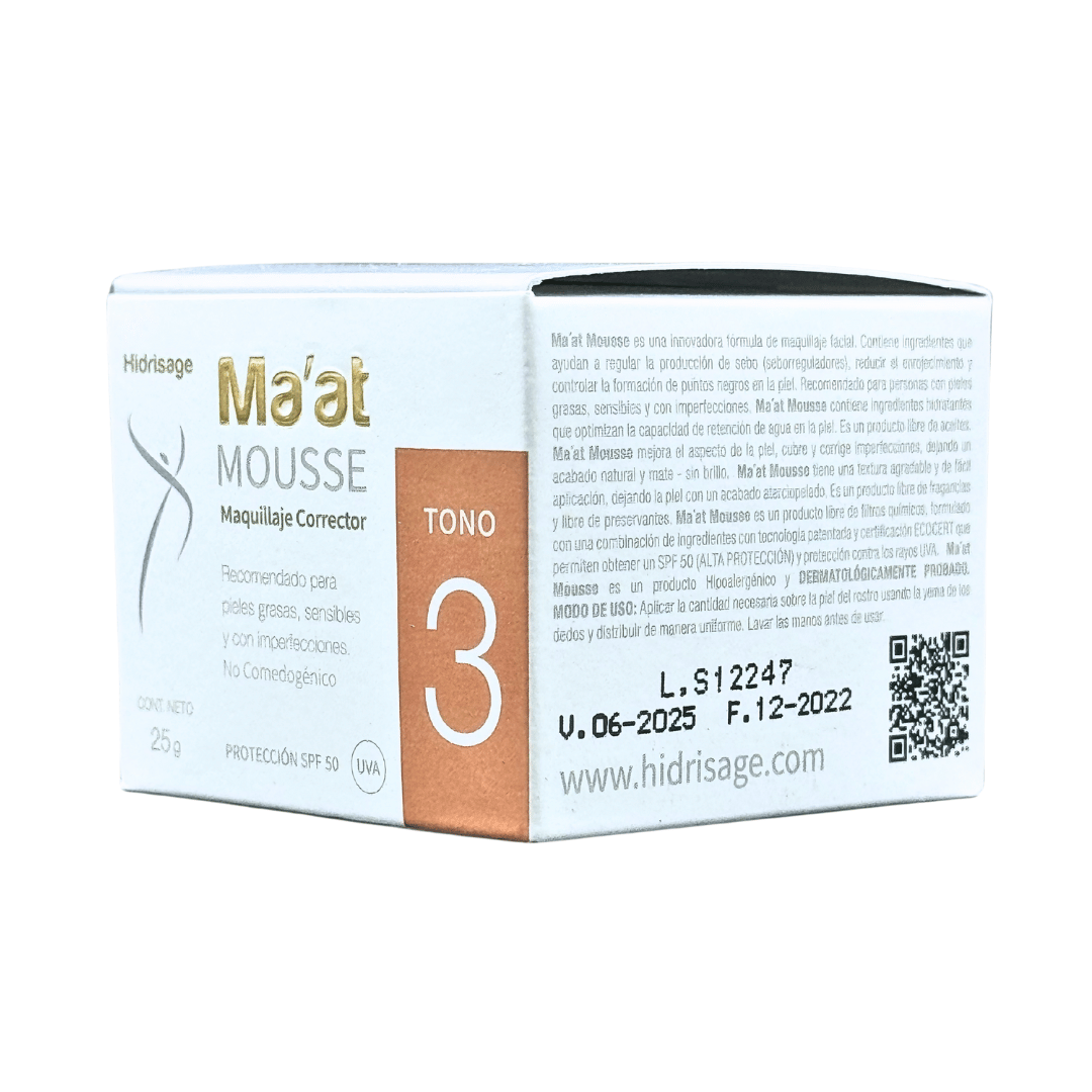 Ma’at Mousse es una innovadora base de maquillaje que proporciona una reducción de la apariencia del acné (comedones abiertos, cerrados, pápulas y pústulas) después de 8 horas de aplicación y disminuyó la cantidad de acné después de 7, 14 y 28 días.
